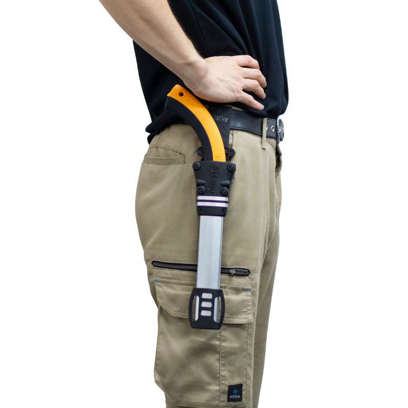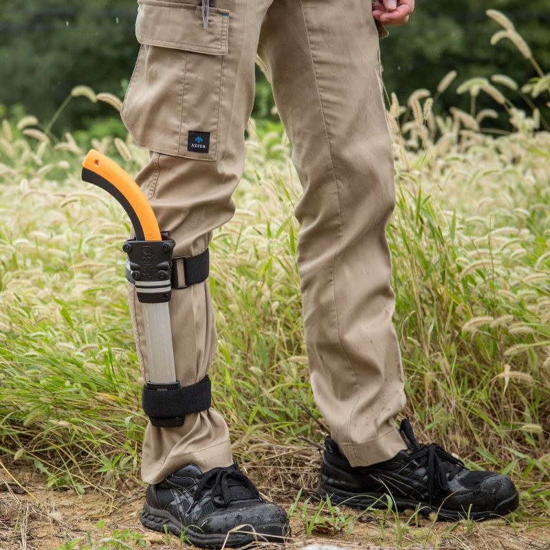専用のレッグストラップ(別売)を装着すれば樹上剪定時も膝下に装着し使いやすくなっています。